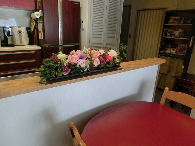 スタッフブログ キリガヤ > スタッフブログ > 完成のお祝いにアレンジメントを スタッフブログ 完成のお祝いにアレンジメントを お客様へリフォーム工事完了のお祝いにお花をお届けしました。 このアレンジメントは市内のお花屋さんにお願いして作っていただいたものです。 ピンク色を基調にしているのに大人っぽい雰囲気がとても素敵ですね。 早速リフォーム祝いでご友人方とのホームパーティーを企画されているS様のところにお届け。 奥様のこだわりの詰まっているキッチンのカウンターへ飾っていただくことになりました。 折角なので、記念撮影を。 ちょっと位置を調整して・・・ パシャリ!! S様、この度は本当におめでとうございます!! 2017年01月21日 4:50 カテゴリー:スタッフブログ <過去の投稿 一覧へ戻る 次へ>