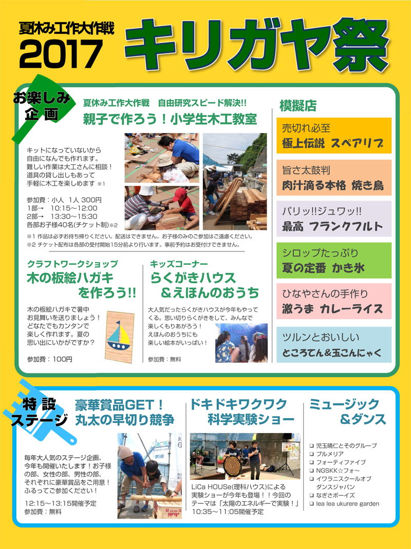 今年も理科ハウスさんの科学実験ショーや、丸太の早切り競争など参加型のイベントもご用意しています!